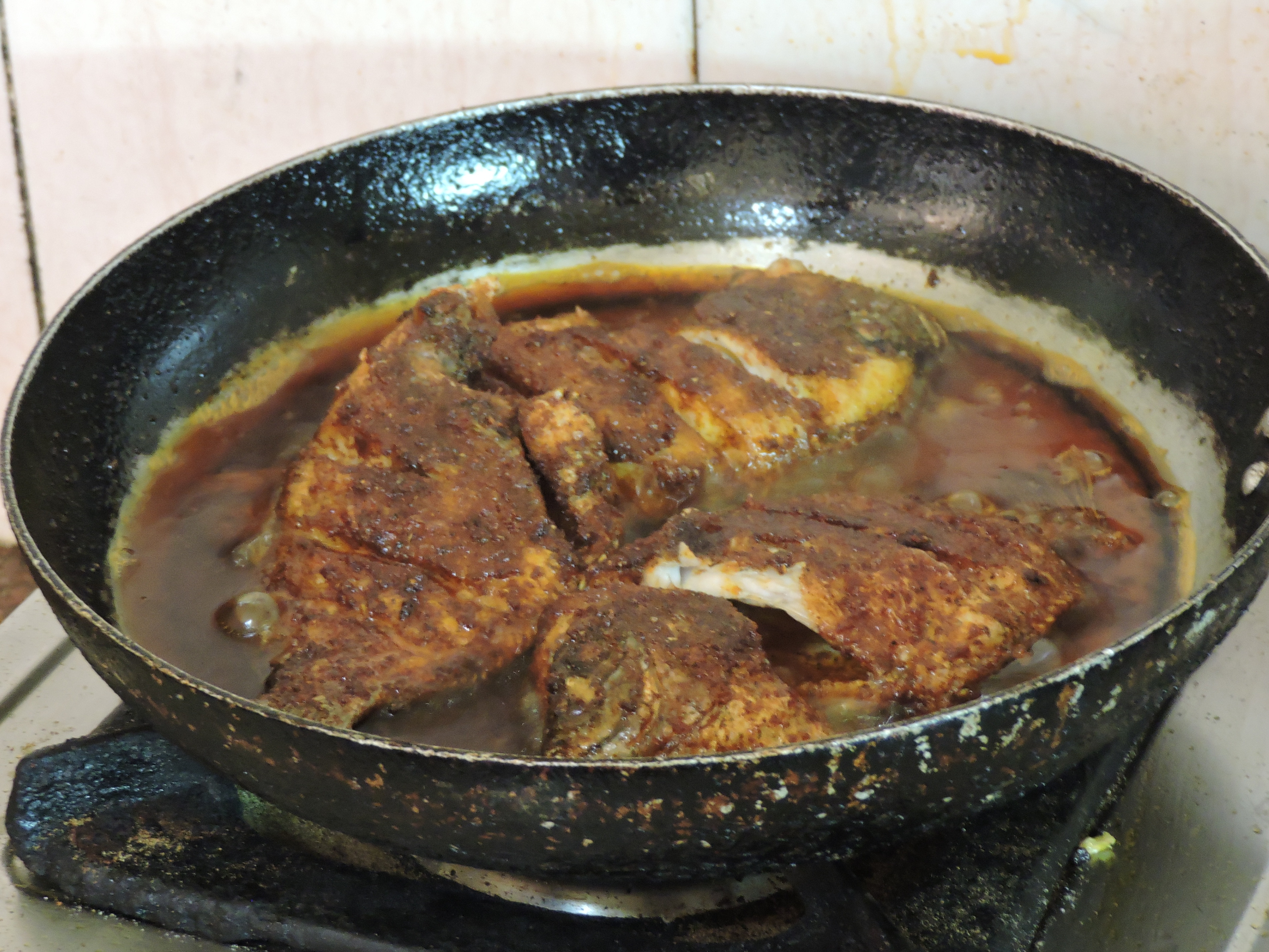 Curious to know what was for lunch, I sneaked into the kitchen. The cook was frying the famous Pearl Spot Fish, known locally as Karimeen, coated in a spice paste. Although fried fish is a staple of Bengali cuisine, we tend to use pungent mustard oil, while Keralites usually use coconut oil. Moreover, karimeen is a saltwater fish which as a group tend to have an entirely different flavour compared to freshwater river fish like hilsa or bhetki. I was really eager to try it out.