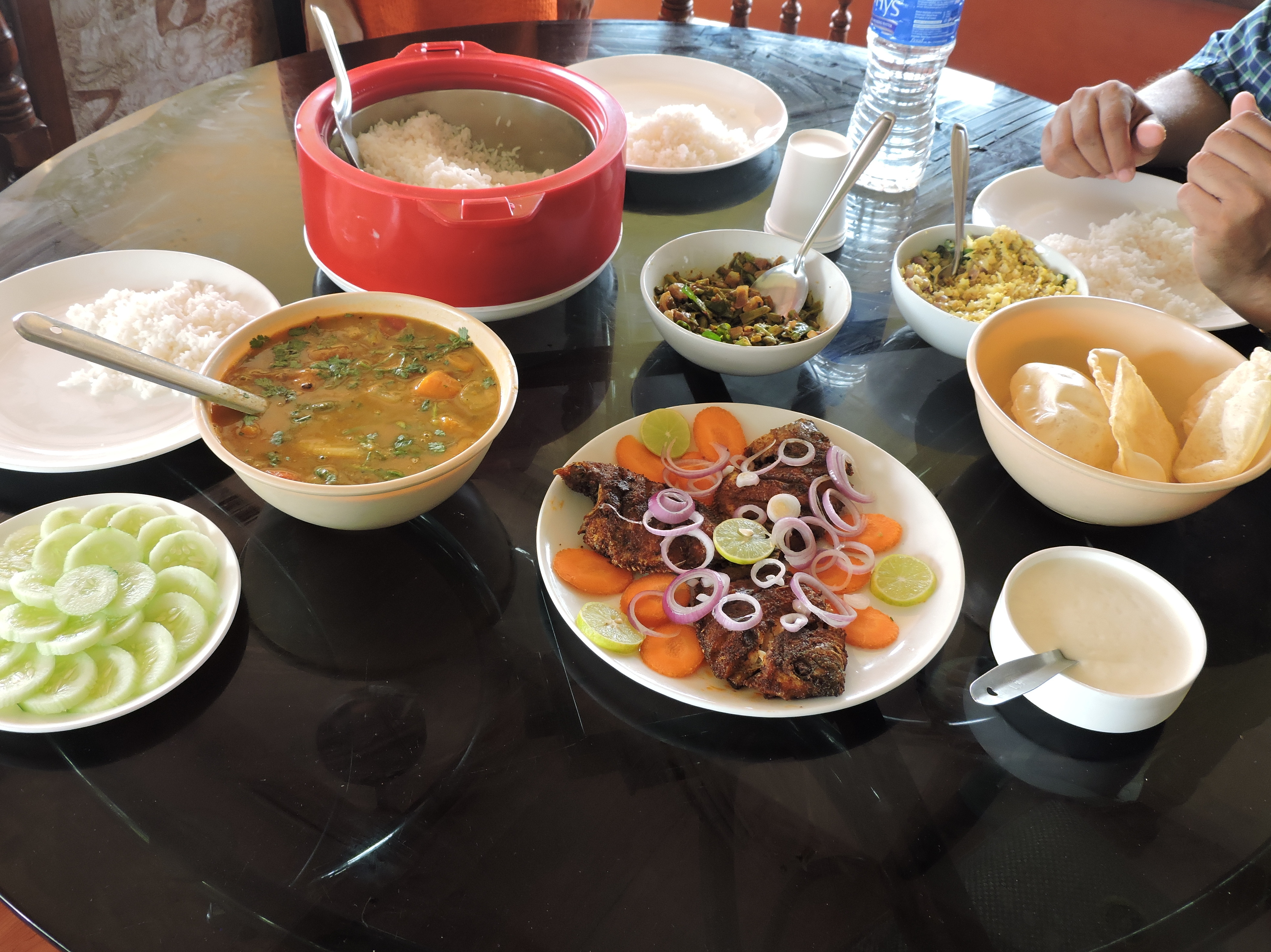 Seated around a table with the view of the backwaters around us, we were served a pretty generous spread : a casserolle of plain steamed rice, a huge bowl of sambhar with all sorts of vegetables in rough, rustic chunks, the famous “thoran”, a medley of cabbage and freshly grated coconut with a tempering of mustard seeds and curry leaves, a dry curry with french beans and onions, and the centerpiece dish: 3 karimeen fries. To accompany all of this we had three huge pieces of “papadum”, a bowl of yoghurt, a simple salad comprising rings of onions slices of carrot and lime, adorning the three pieces of fish like jewels in a crown, and slices of fresh cucumber on the side.