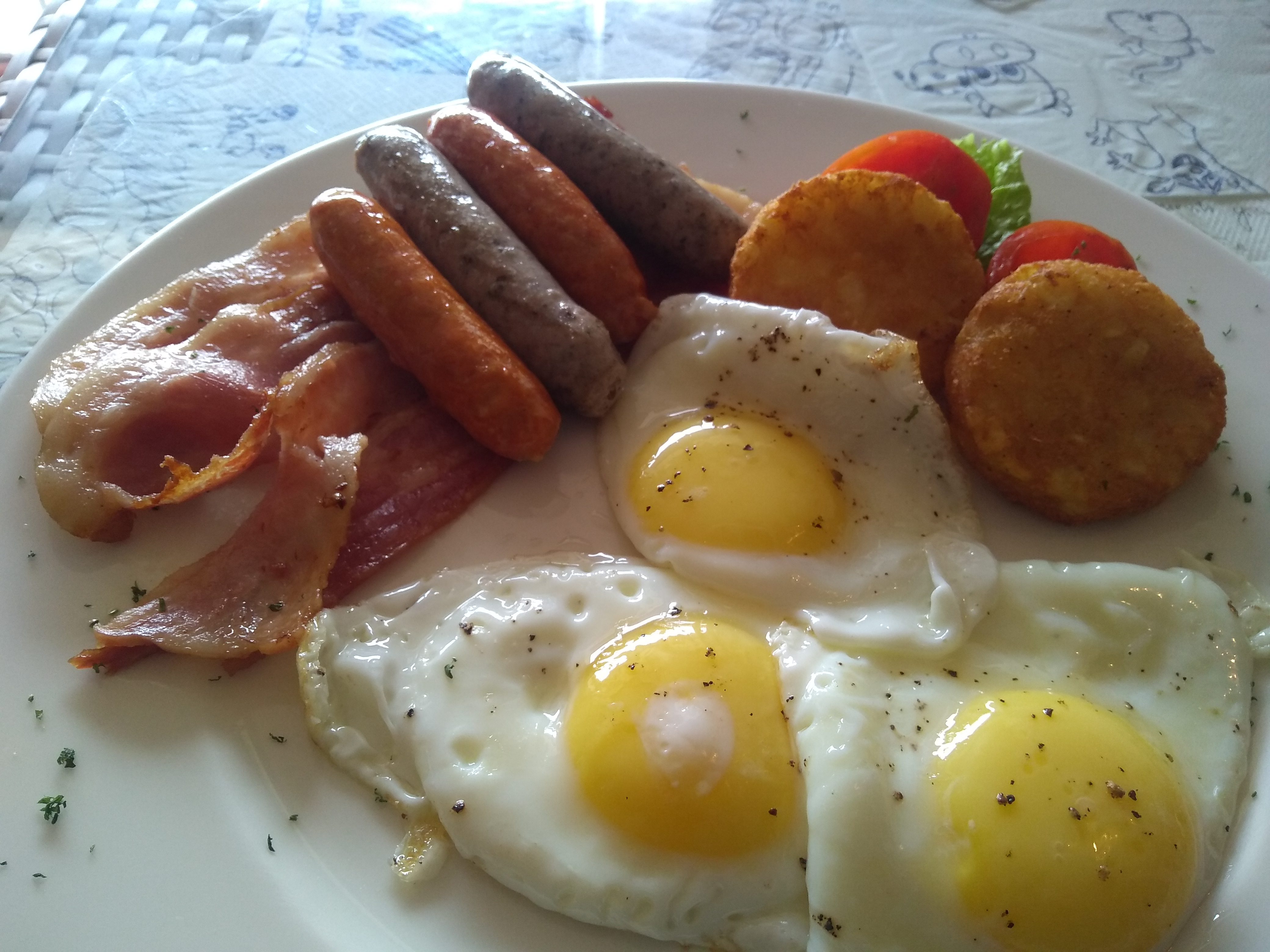 Fried eggs with bacon and sausages