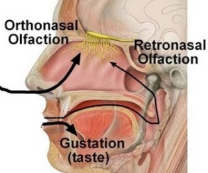 So how does flavour come about? When you taste a particular food, part of it dissolves in the saliva to be picked up by taste buds and categorized into one or more of the five tastes (gustation), and that’s where the tongue’s job ends. The rest of the work is done by the nose. Volatile aromatic compounds can reach the nose directly from the outside (orthonasal olfaction), while those already inside the mouth waft to the back, move up to the nasopharynx (the part of the throat lying just behind the nasal cavities) and into the nose, via a backdoor entry (retronasal olfaction). Either way, these molecules stimulate our sense of smell, which when combined with the sense of taste, gives us the complete flavour of whatever it is that we are eating.