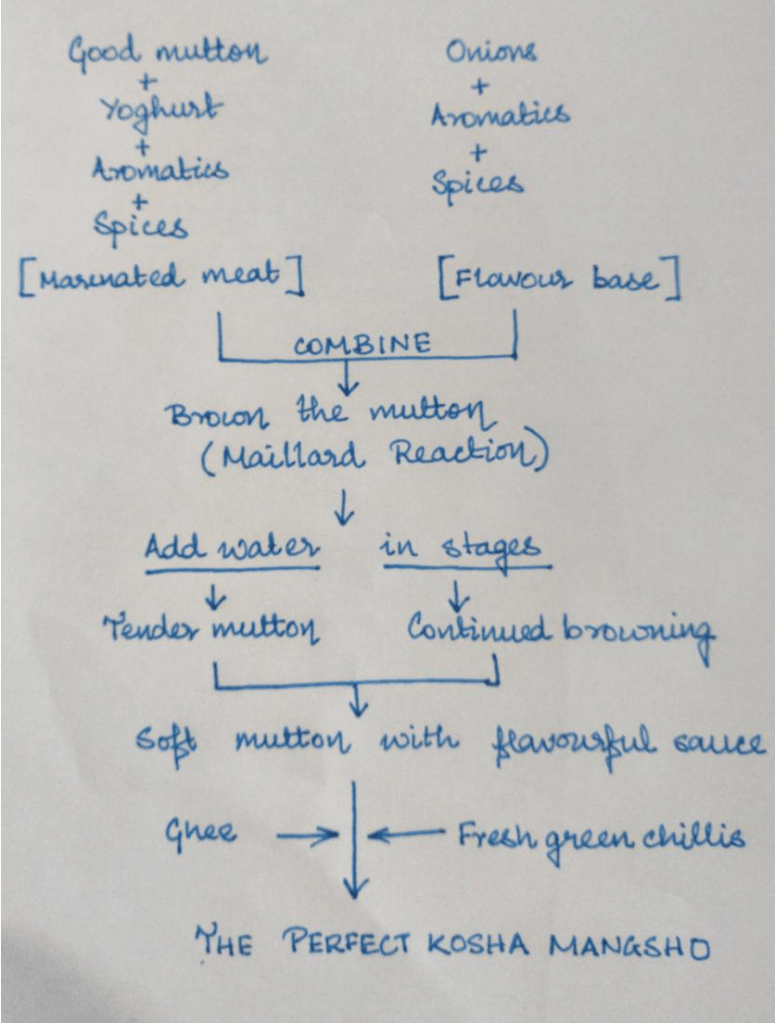 The flavour of a well-made kosha mangsho is like the sound of a symphony orchestra. There are layers to it, and one of the most important layers is the Maillard reaction. It is a chemical reaction involving amino acids and sugars that produces a set of complex aromatic molecules that impart a distinctive flavour to browned foods. It is the flavour of the sear of a steak, the crust of a brioche, the toastiness of a marshmallow. It is the reason why a browned chicken breast tastes better than one that is boiled. And prolonged, controlled browning is the secret to a good kosha mangsho. During browning, the Maillard reaction takes centre-stage as the proteins in the meat and the sugars in the caramelised onions and yoghurt start to interact, creating an amazing array of flavour compounds which gives kosha mangsho its identity.