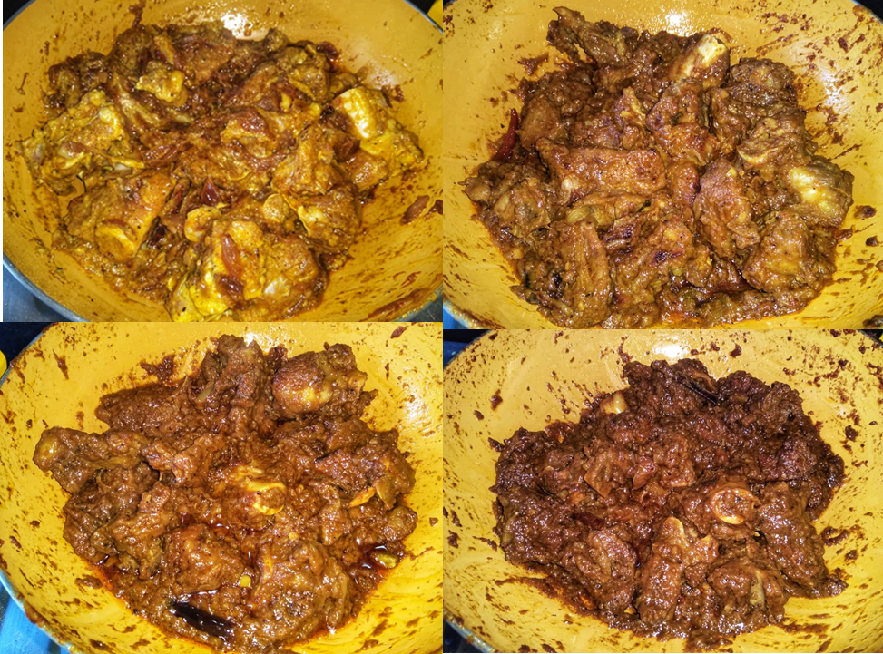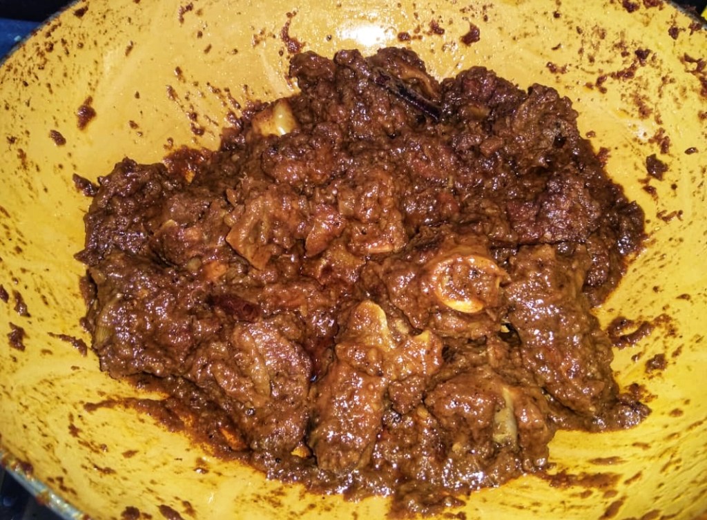 Apart from a long cooking time, you can obtain tender meat by marinating it in a mix of yoghurt, aromatics and spices before the cooking begins. Acids in the marinade helps break down proteins which tenderizes the meat, allowing the flavours to penetrate even before the cooking has started. A lot of Indian meat dishes begin with this step, and kosha mangsho is no exception. You could marinade the meat overnight; the longer you keep it, the better. With the marination sorted, it’s time to get cooking. I’ve followed the recipe by Bong Eats and the result was fabulous. If you want to give it a shot yourself, check out their detailed recipe here. https://www.bongeats.com/recipe/mutton-kosha