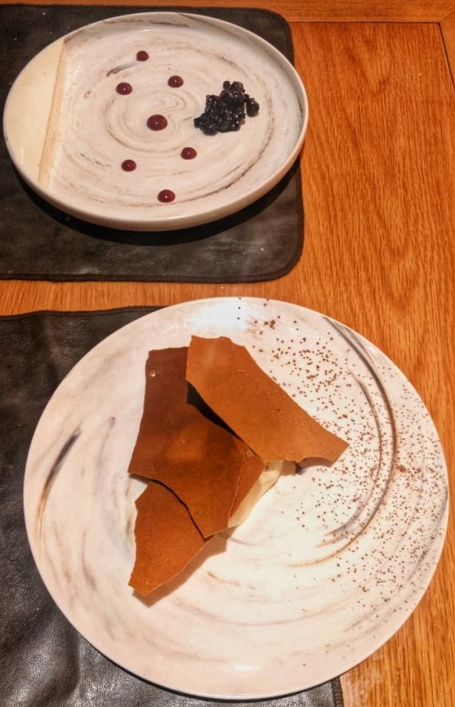 A plate with some meticulously piped dots and an untidy dollop, looking like a novice’s attempt at scooping ice-cream, arrives at the table. Confused, I ask the waiter what the dish is, and he shakes the plate a little. And something stirs at the edge of the plate. It’s a panna cotta.