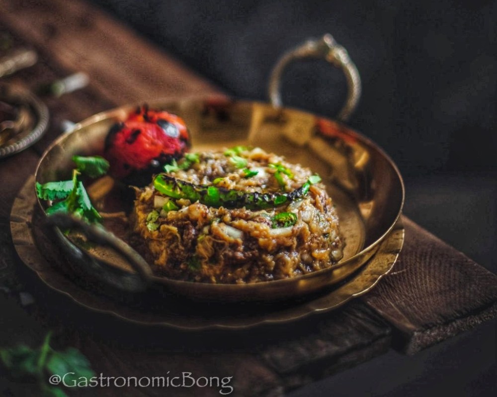 Cooking over a direct flame isn’t that common in Bengali households, unlike the Western barbecue or North Indian kababs, but there is are certain simple items that are : think of the shyeka papor, the healthy alternative to frying a papad which in my opinion tastes so much better. There is another dish that employs this technique which is an absolute favourite of Bengalis. Begun pora involves roasting whole aubergines over a direct flame till the skin blackens and wrinkles while the flesh turns soft. It is then mashed with mustard oil, onions, green chillies and some salt. What we end up with is a gorgeous mash, perfect to be scooped up with a few rootis for an incredibly satisfying dinner. This is comfort food at its very best.