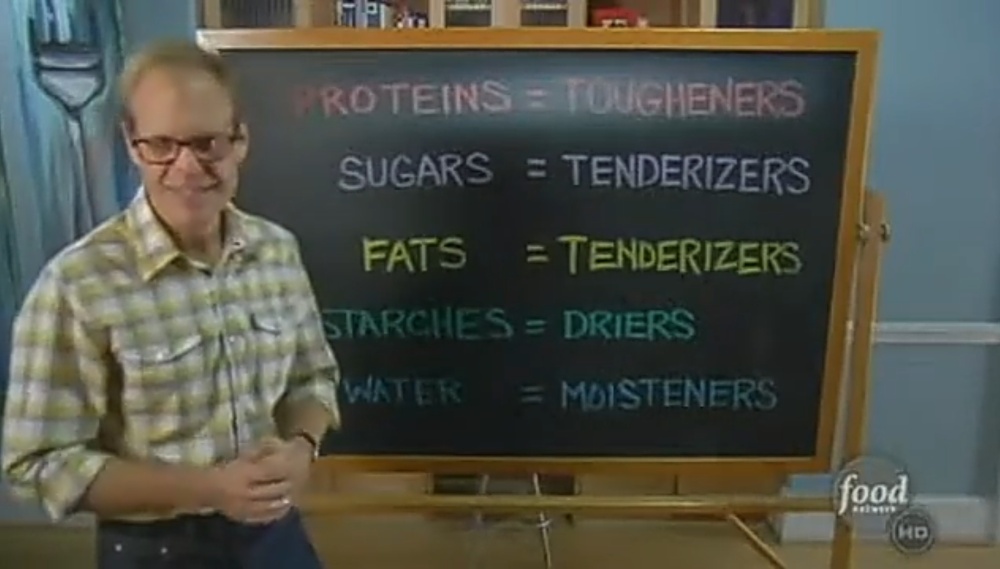 You could divide cake ingredients into the simple categories of dry, wet and leaveners, but I prefer the categories as described by Alton Brown of Good Eats. According to Alton, here are five primary varieties of ingredients in a cake batter, four of which come in antagonistic pairs. There’s the tougheners and tenderizers, and the driers and moisteners. The fifth category includes the flavouring agents, and since they contribute little to the actual structure of the cake, we will address it later.