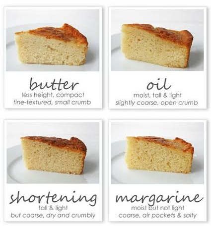 Although egg yolks contain fat, the primary fat source in a cake batter is the butter which is one of the primary tenderizers in the mix. Alternatives of butter are oil ,shortening and margarine, each of which produces a slightly different end-result. Butter, as we’ve seen, prevents gluten strands from linking, producing a tender product. Another tenderizer is the sugar, which by virtue of its hygroscopic action, holds on to water. Sugar, of course, contributes to the sweetness in a batter and helps in browning. A cake with less sugar will not be as browned or moist; go too far and the top might become sticky. Brown sugar contains added molasses which has a greater tendency to cling on to moisture compared to white sugar, creating a moister cake or a chewier cookie.
