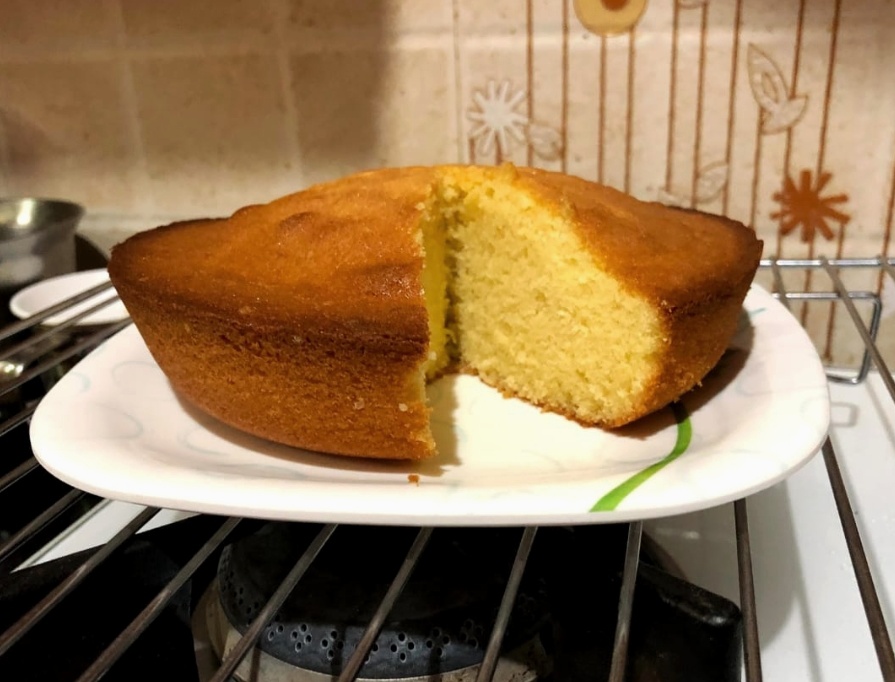 Anyways, back to our classic creaming technique. When all the sugar has dissolved in the butter and the mixture doesn’t feel gritty between the fingers, the eggs are added gradually and the batter mixed till homogenous. This is followed by the addition of flour, which will bring the runny liquid together into a thick batter. This is also the time to add any additional flavourings. With the batter properly mixed and ensuring that there are no large lumps of flour left, the batter is ready to be poured into tins and baked. The oven tempeature is crucial : too high and the top cooks much faster than the middle; too low and you run the risk of not getting any browning at all.
