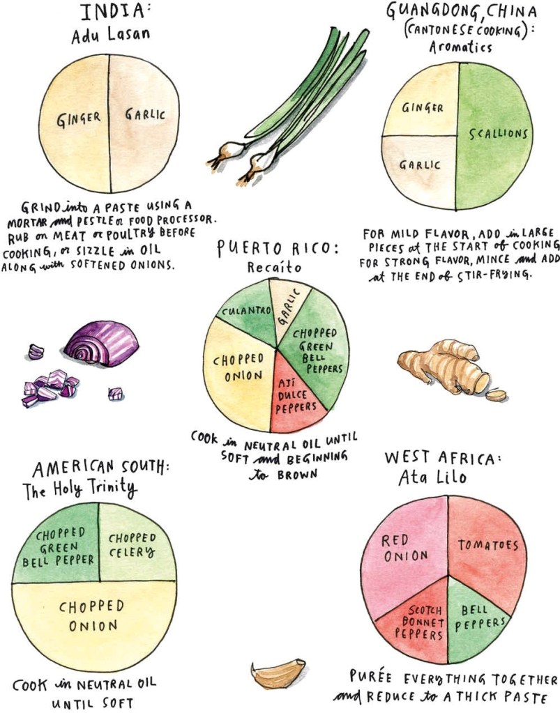 It is time to bring variety to the party with the flavour foundation of our stew, aka the aromatics. Almost all Indian dishes begins with a tempering of whole spices, followed by a trinity of onion, ginger and garlic. Chinese dishes start off with a base of ginger, garlic and scallions, with touches of spices like star anise and Sichuan peppercorn. Cajun dishes from the American south start with a mix of onion, celery and bell peppers, often referred to as the Holy Trinity.