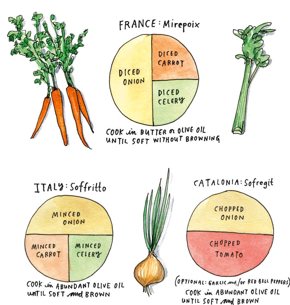 And then there are the European flavour bases. From the famed French trio of onion, carrot and celery called a mirepoix to its Italian equivalent called a battuto that cooks down to a soffritto, to the similar sounding Spanish sofrito that combines onions with garlic and tomatoes, the base for classics like paella. The choice of spices and aromatics at the start of the cooking process is what makes each dish unique, and lends the dish a geographical identity.
