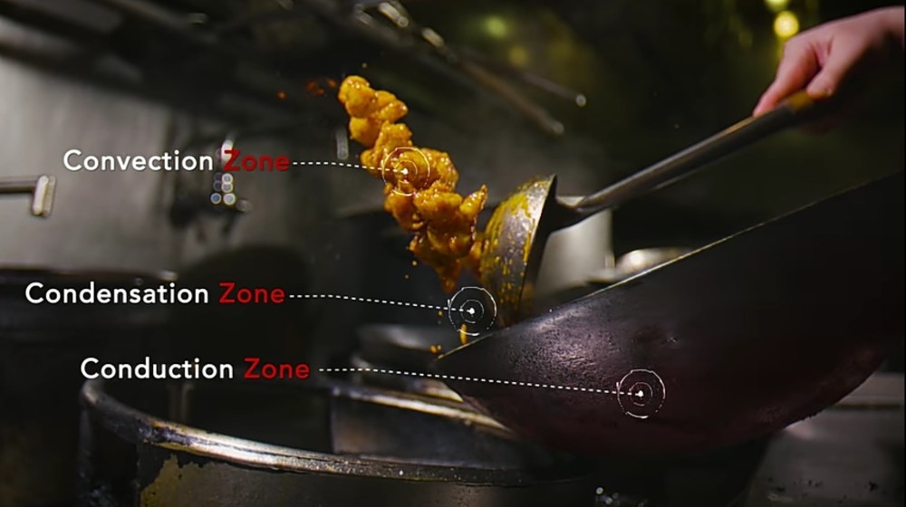 Before moving on to the stir-fry, let’s take a quick aside to examine the temperature zones in a wok. The conduction zone is a searing 750-800 degrees Celsius. Food here is heated by direct contact with the pan and helps to sear the meat and make the aromatics pop. The middle condensation zone, higher up, is around 100 degrees Celsius. Here the steam partly condenses to water, imparting large amount of latent heat of vaporization to the food. Even higher up is the coolest convection zone, at around. It is still hot enough to cook food, but it occurs at a much slower pace. The trick is to keep the food moving between these temperature zones to get the desired effect.
