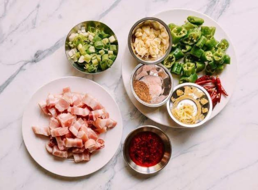 Although we are used to eating stir-fries as special, celebratory dishes at Chinese restaurants, for the Chinese housewife it is a much more everyday affair, and some everyday stir-fries can be really simple. A great example is the Qingjiao Rousi or Pork with Chillies recipe from Chinese Cooking Demystified. Ginger and garlic in oil, in go the sliced chillies, season with a splash of cooking wine and soy, add the pre-fried slivers of marinated pork, mix, turn off the heat, and finish with a little bit of sesame oil, “and……out”. You’ve got all five components of a stir-fry and the dish comes together within minutes. With the only “special” ingredient being the pork, this dish is an easy, quick and delicious weeknight meal.