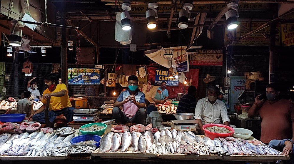 “Sunday morning bazaar for Mr. Mukherjee is as important as a round of golf at the Royal Calcutta Golf Club. He examines the gills of Calcutta’s fish of fishes, bhetki, or he lifts a tiger prawn from its bed of crushed ice to verify if the crustacean can hold up its head, a sign of freshness. The deal is clinched. The purchase safe in a green plastic bag is put into a portable ice box in the boot of his little white Maruti. In a few hours the prawns reappear in coconut milk as badga chingrir malai curry. The seasoned shopper waits for the greenhorn to move off before settles down to haggle over hilsa, strikes a better bargain and leaves with the pick of the catch peeping out of a hole of his well-worn shopping bag.”