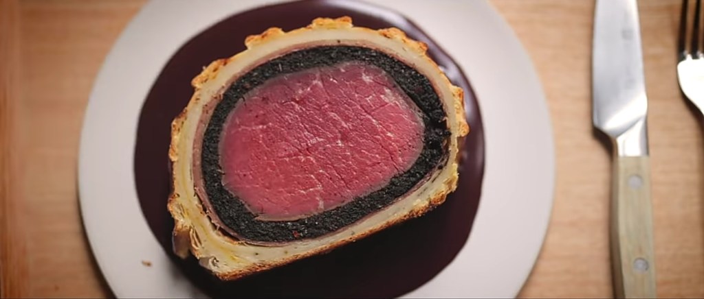 One of the most well-known savoury applications of puff pastry is the beef Wellington. It involves coating a piece of tenderloin in a layer of mushroom duxelle, then wrapping it in a layer of crepes. The entire thing is encased in puff pastry, baked and served with a red wine sauce.