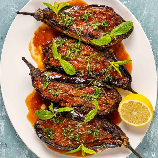 “İmam bayıldı” literally translates to “the Imam fainted”, as legend has it that the Imam swooned on tasting this delicious dish of eggplant stuffed with tomatoes, onions and garlic. A variant of the dish called Karnıyarık, adds ground meat to the filling. Two other Turkish eggplant dishes include patlıcan bıber, in which eggplants are cooked with its nightshade cousin, the bell pepper; and the paradoxically named patlıcanlı kebap (eggplant kebab) in which pieces of eggplant are skewered alternately with finely chopped meat and cooked over a flame.