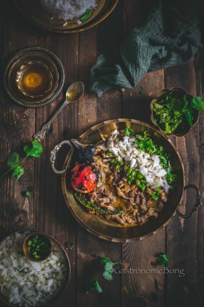 Bengal’s addition to the mashed eggplant compendium is ridiculously simple yet absolutely delicious. Mash the flesh up roughly, add some pungent mustard oil, finely chopped onions and green chillies, and season with salt. You could add some roasted garlic or some chopped tomatoes, roasted or fresh. A generous handful of freshly chopped coriander, a quick mix and you have one of the simplest yet one of the most delicious Bengali comfort foods, begun pora (burnt eggplant). Not as heavy-handed with spices as the bharta, it combines a handful of ingredients which create a symphony of flavours in your mouth.