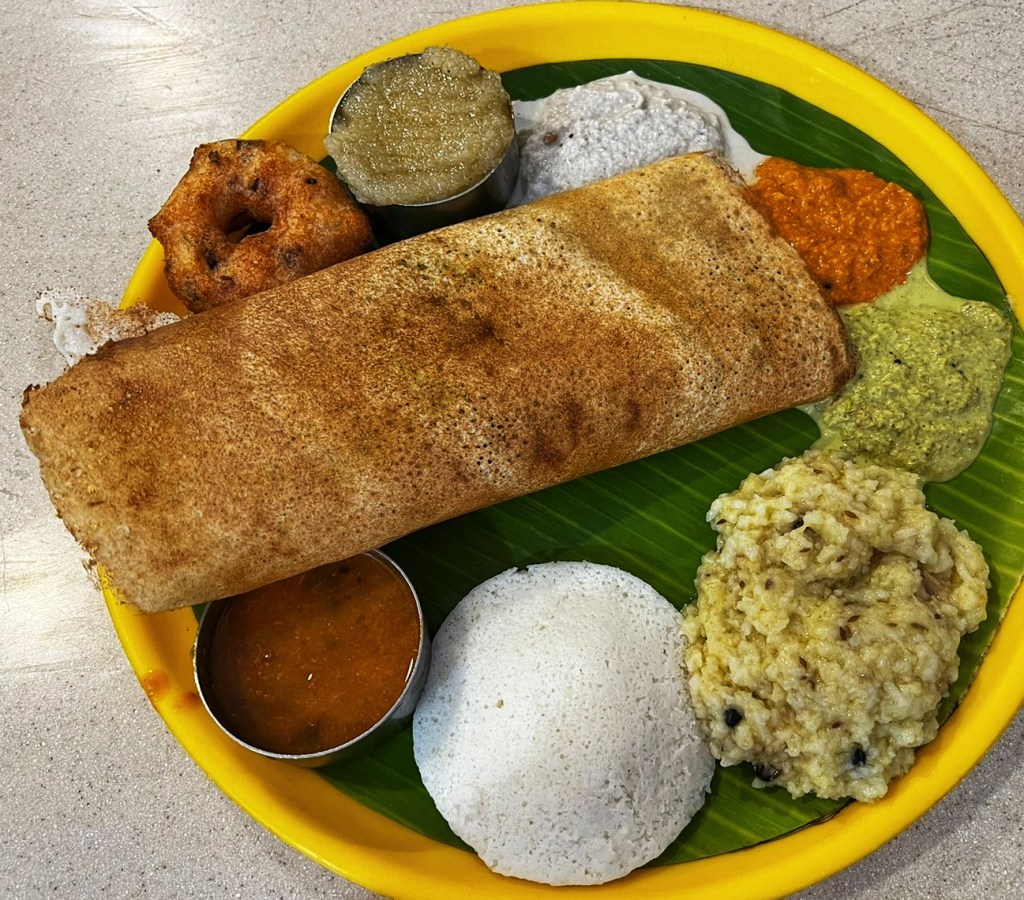 The two Vidyarthis sitting opposite us ordered idli and vada, both of which reached the table quickly, bathed in sambhar. The South Indian breakfast relies heavily on fermentation. From fluffy idlis to crisp dosas, and vadas that are crunchy on the outside and melt-in-the-mouth inside, they are filling and delicious. Infact, just a few days before the Vidyarthi Bhavan visit, I had eaten breakfast an iconic Tamilian restaurant chain called Adyar Anand Bhavan, referred to as A2B for short, to sample the Great South Indian breakfast; a delicious platter of dosa, idli, vada, sambhar, a trio of chutneys, Pongal (a khichdi like concoction made with rice and flavoured with whole spices) and Rawa Kesari, the Tamilians’ version of the Kesari Bath.