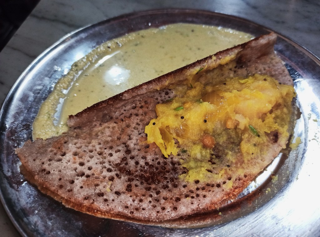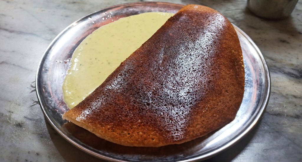 Then came the waiter, a man who has no time for fake pleasantries. You place your order, and you do it quickly, this is no place for QnA sessions about the menu. So out shot the orders: two masala dosa, one kesari bath, and one coffee. The dosa needs to be freshly made, while the big batch of kesari bath, Karnataka’s version of semolina pudding, is already prepped, so it hits the table first. Ignoring all etiquette of savoury before sweet, I tucked in. And man, was it good! Drenched in ghee and scented with cardamom and clove, it had a wonderfully soft consistency and lemon yellow hue. It was laden with toasted cashew and bits of pineapple, which added a fresh bite to offset the richness.