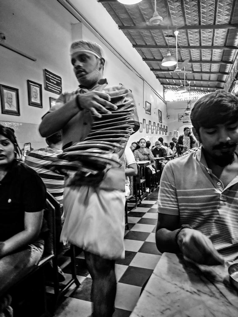 A2B has options of both table service as well as self-service. Vidyarthi Bhavan on the other hand, despite the massive rush, has no self-service. The servers bring the dosas, 15-20 at a time, stacked atop each other and dexterously supported using the arm and forearm. With deft precision and impeccable memory, he serves up whatever each customer asked for: plain, masala, or sago dosa, each of them a brown, crisp semicircle on a round, steel plate. The other half of the plate gets filled next by another server, who closely follows suit and pours the coconut chutney into the empty space. Tableside theater at budget price.