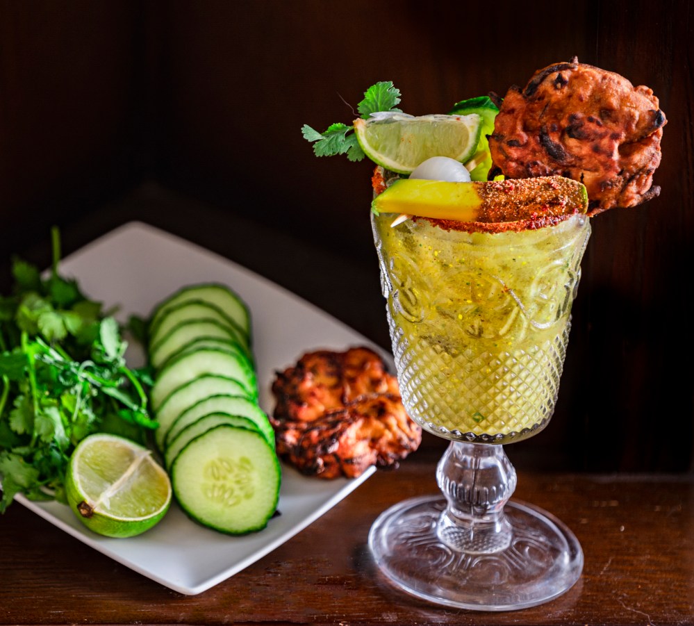 Rim a tall glass with a mixture of chaat masala and red chilli powder. Lightly muddle a few sprigs of cilantro in a cocktail shaker and mix all the ingredients with ice. Shake vigorously and strain into a tall ice-filled glass. Garnish as per your liking. I used garnishes include coriander sprigs, cucumber slices, lime and raw mango wedges, pickled onion, and deep fried onion fritters (peyaji).