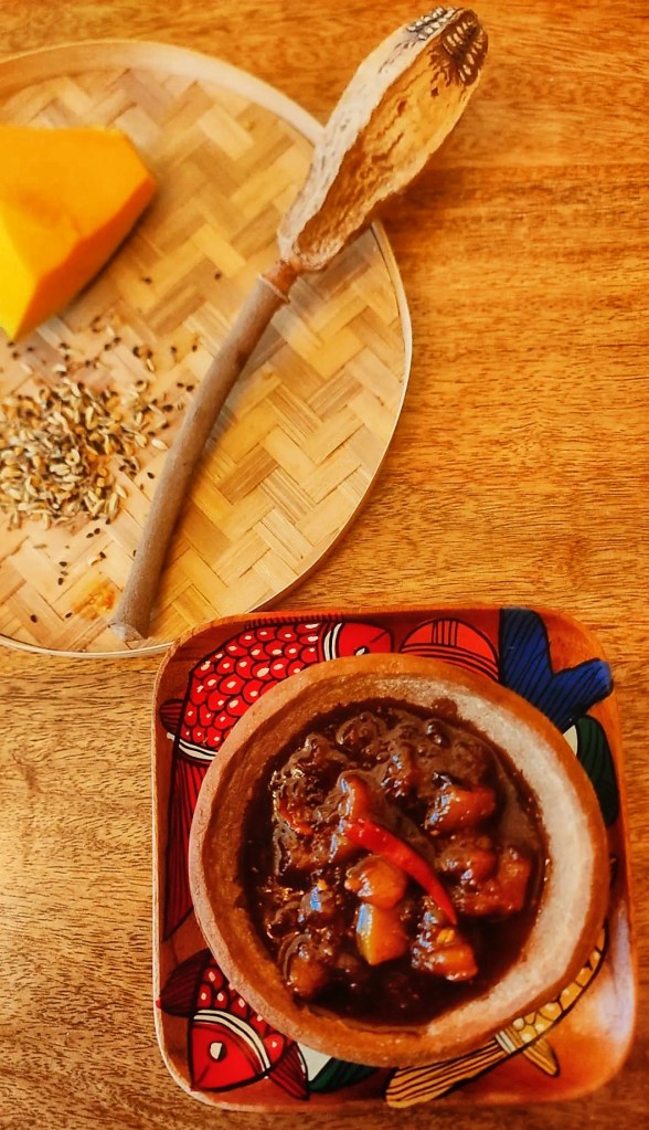 পাকা কুমড়ো একটা ছোট বাটি, ছোট করে কাটা