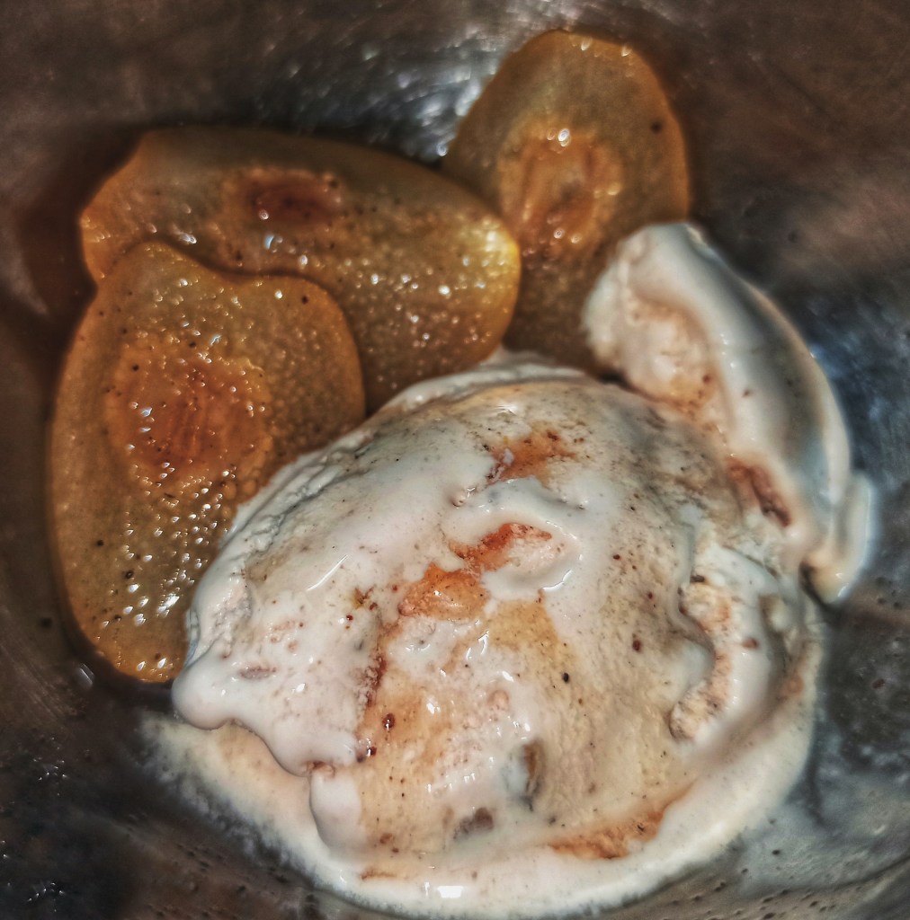 You could easily get away with a vanilla ice cream, but I wanted to take it a step further, since it didn’t involve any extra effort on my part (I was gonna order in the ice cream anyway). I turned to my go-to reference for flavour pairings, Niki Segnit’s Flavour Thesaurus, which introduced me to a combo I had never thought of before: fig and cinnamon. I love fig ice cream, and adding it would bring to the dish another element of texture: the chewiness of reconstituted dried fig, a nice, fruity foil to the fresh bite of the poached pear. So, fig it will be. When the ice cream arrived, I merely let it sit at room temp for sometime, metamorphosing it into a delicious puddle.